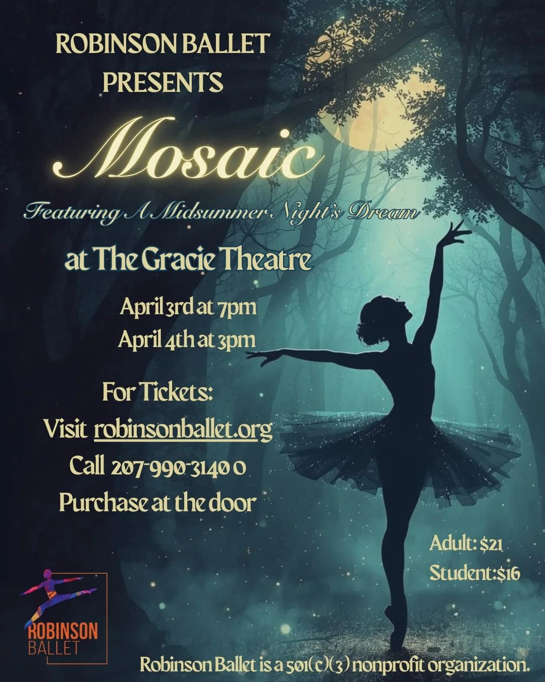 Robinson Ballet Presents Mosaic: on April 3rd and 4th at the Gracie Theatre. Robinson Ballet’s annual Mosaic performance highlights the company’s long history of creating diverse and exciting works of dance in all styles.